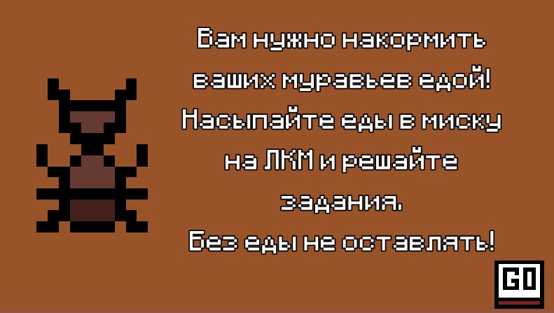 Игра, в которой вам нужна 60 секунд утолять голод муравьев. Для пополнения миски с едой вам потребуется решать задания, а жадные коты не дадут вам заскучать. Сделана на Годот за 3-4 часа